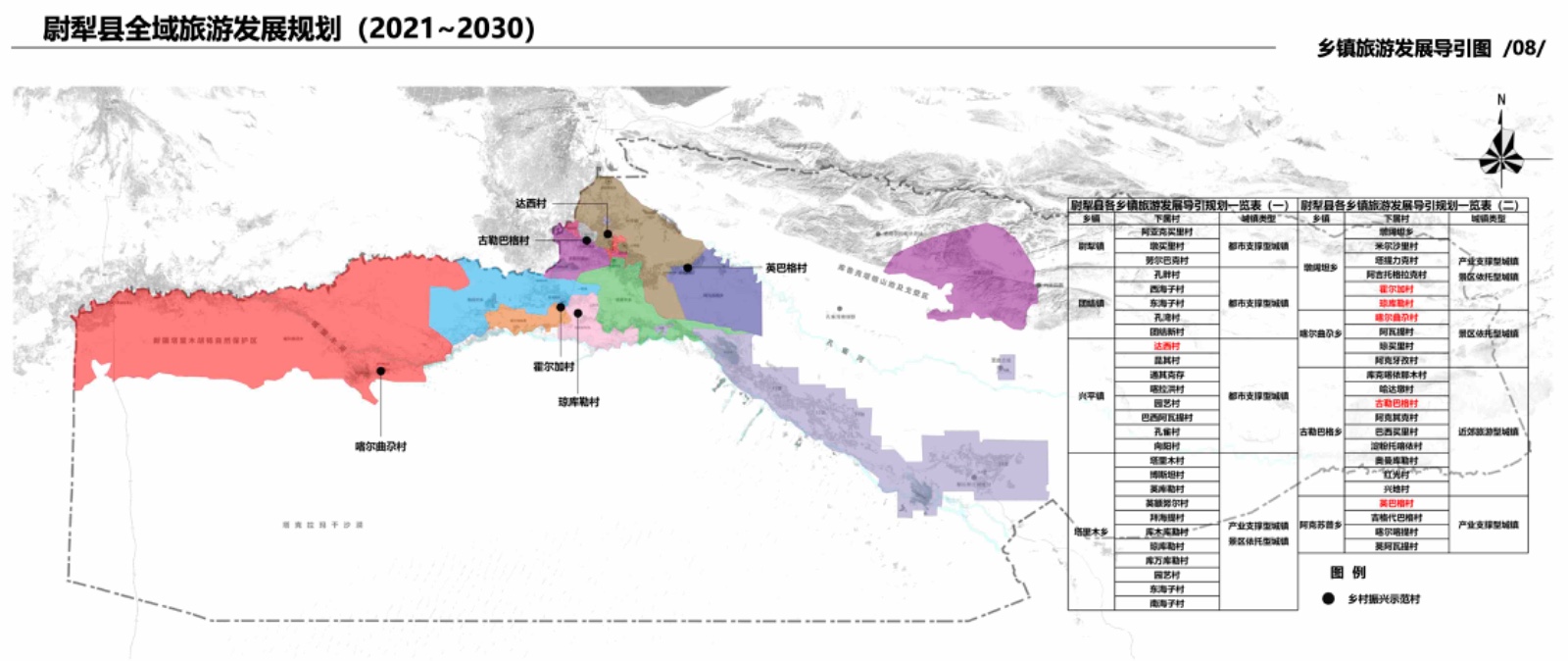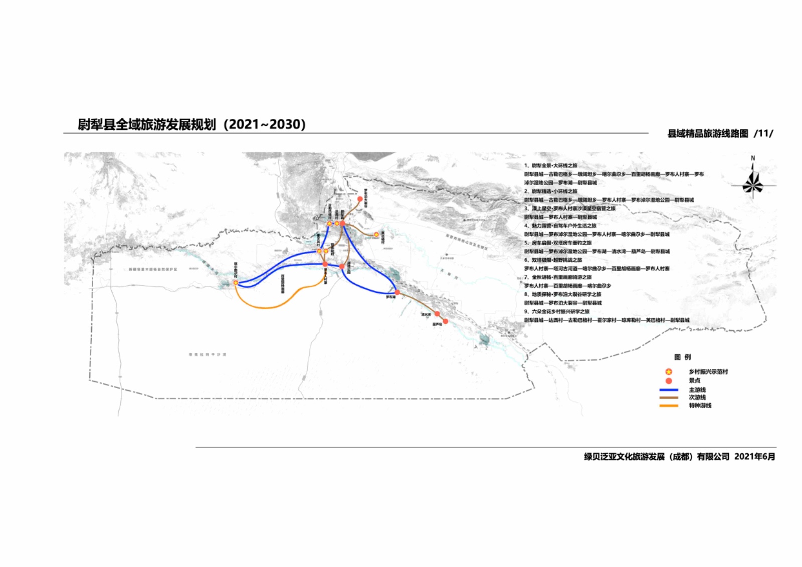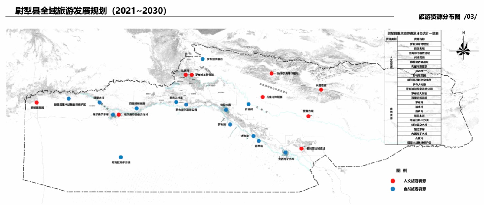 项目简介:尉犁县全域旅游规划工作始于2020年,我们以挖掘尉犁县当地历史文化底蕴和自然资源为核心,旨在激活地方经济、推动乡村旅游繁荣,实现文化旅游资源的保护性开发与利用,促进尉犁县的可持续发展与文化传承。规划中提出以“罗布人村寨景区+尉犁县城”为双核引爆尉犁县全域旅游发展,构建“一带一环两核三区六点”的旅游空间布局,三区联动,六点助力,实现多元化、高品质的旅游体验。即:一带:G0711+G218最美自驾风景廊道;一环:尉犁县全域旅游环线;两核:罗布人村寨、尉犁县城;三区:沙漠探险旅游区、乡村旅游体验区、古烽燧遗址保护区;六点:达西村、古勒巴格村、琼库勒村、霍尔加村、喀尔曲尕村、阿克苏普村。时至2023年6月,尉犁县成功入选自治区全域旅游示范区创建名单。